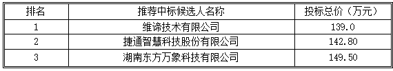 湖南国联招标有限公司受湖南省农村信用社联合社的委托,对湖南省农村信用社联合社2026-2028年度星沙数据中心基础设施维保采购项目(重招)(招标编号:0646-264HNGLN0002-1)所需货物和服务进行国内公开招标。本项目的招标采购讯息于2026年3月4日在“中国招投标公共服务平台”(http://www.cebpubservice.com/)、“湖南省农村信用社联合社官网”(http://www.hnnxs.com)上发布。开标仪式于2026年3月25日上午9:30(北京时间)在长沙市开福区黄兴北路112号华润置地中心2号栋45楼湖南国联招标有限公司开标,随后进行评标。评标委员会成员经过认真、仔细的评议,并提出评标报告,推荐的中标候选人排序如下: