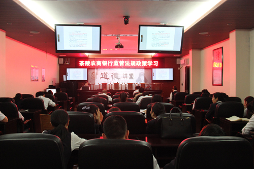 为使全体员工系统学习和掌握相关法规政策精神,提高其基本法律法规素质和防控风险的能力,真正做到稳健经营,茶陵农商银行制定了《开展银行业法规政策落实年活动方案》,重点以银监部门和省联社、市办事处下发的《商业银行公司治理指引》、《商业银行市场风险管理指引》等37项核心规章制度为主体,以其他规范性文件为辅助,建立法规政策学习培训常态化机制,将全员学习与条线学习相结合,认真掌握银行业各项法规政策的要求。