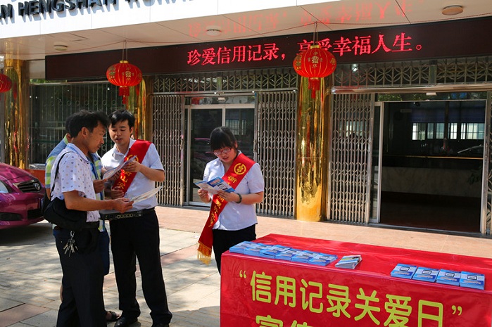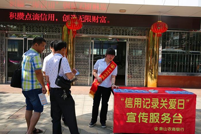 近日,衡山农商银行通过搭建平台、丰富载体,集中开展 “6.14信用记录关爱日”活动,营造了“人人关心,人人参与”的氛围,取得了良好的宣传效果。活动中,该行通过网点LED电子屏滚动播放“关爱信用记录,享受幸福人生”等宣传标语120条,设立宣传服务台2个,张贴宣传海报16张,派发《个人信用报告常见问题解答》宣传折页2500份。向公众解答了什么是个人信用报告、如何查询征信信息、征信信息异议处理、如何保持良好信用记录等问题,并引导前来办理业务的客户积极参与《三湘征信》微信公众号的有奖答题互动,受到了客户的一致欢迎。该行通过此次征信知识专题宣传活动,有效推广普及了征信知识,增强了群众诚信意识,进一步推进了社会信用体系建设,优化了当地金融生态环境。