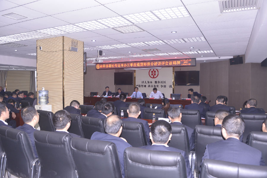 10月17日在市办事处召开2017年三季度经营形势分析讲评视频会议,班子成员和主任助理从临武主会场返社后,桂阳县联社立即于10月18日上午组织各部室负责人、各信用社主任和清收工作队各组长召开了传达贯彻会议精神的会议。