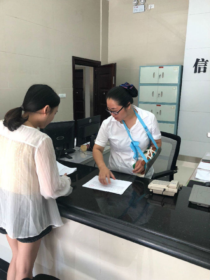 该名工作人员正是通道农商银行营业部的主管会计刘牡丹,上星期在上班途中不小心将手臂摔成了骨折,打了石膏,吊了绷带。为了不给营业部工作拖后腿,修养一个星期后,刘牡丹坚持来到单位上班,用单手干起了她的工作。同时,为了完成近日的“e”支付的推广任务,刘牡丹同志不顾手上的伤痛,和同事们利用午休时间上街进行推广。工作之余她还跟同事们开玩笑的说:“幸好受伤的是左手,不然真成废人了。”