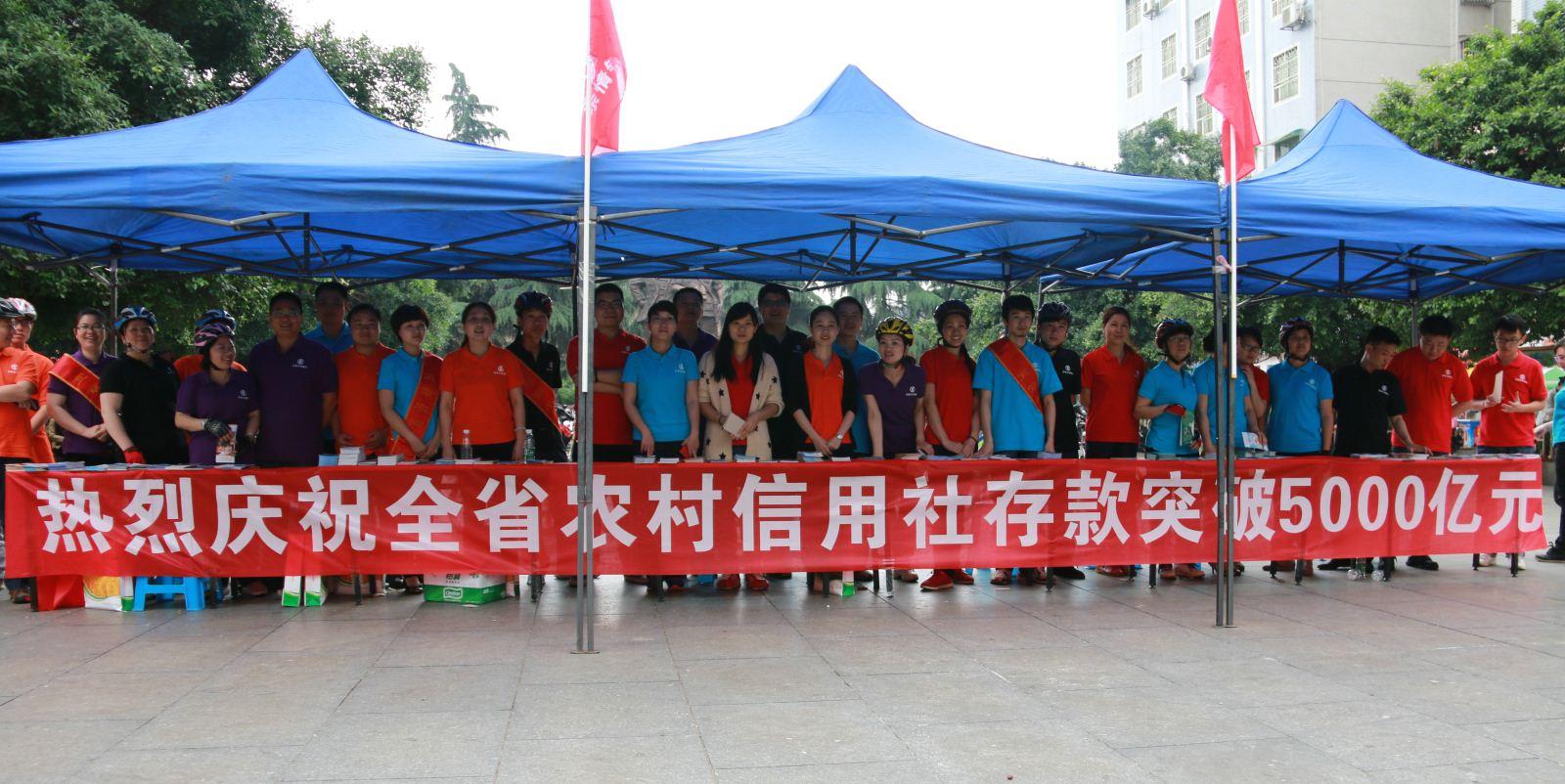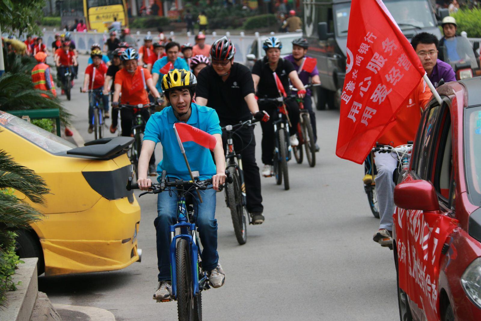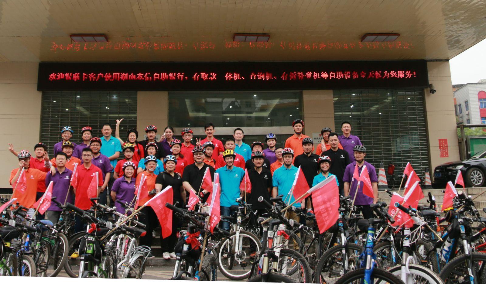 5月7日,宜章农商银行42名员工身着印有统一LOGO的T恤,骑着载有宣传彩旗的自行车,列队沿县城主要街道展开“热烈庆祝湖南省农村信用社存款突破5000亿”和湖南农信新产品骑行宣传活动,赢得了市民群众的加油和喝彩。