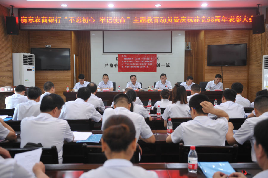 7月5日,衡东农商银行隆重讲话开 “不忘初心、牢记使命”主题教育动员暨庆祝建党98周年表彰大会。党委书记、董事长李来华强调,要把思想和行动统一到省联社、衡阳办事处关于开展主题教育的决策部署上来,要以更高的政治站位、更强的政治自觉,把责任扛在肩上,把工作抓在手上,把措施落到实处,确保主题教育扎实有力开展。党委班子、副协理员、各党支部书记及全体党员共计117人参加会议。