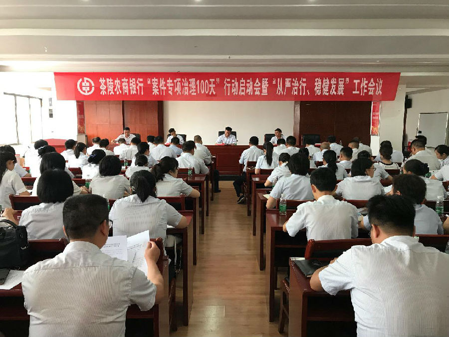 8月29日,茶陵农商银行“案件专项治理100天”行动启动会暨“从严治行、稳健发展”工作会议在附属楼五楼会议室召开。总行班子成员、各网点(部室)负责人、信贷主管、委派会计、机关全体员工共计150余人参加会议。会议由党委副书记、行长左胜杰主持。