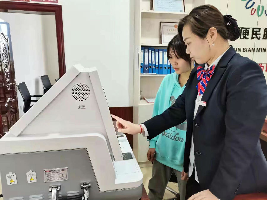 姜畲支行工作人员在福祥e站便民服务终端上指导村民办理业务。
