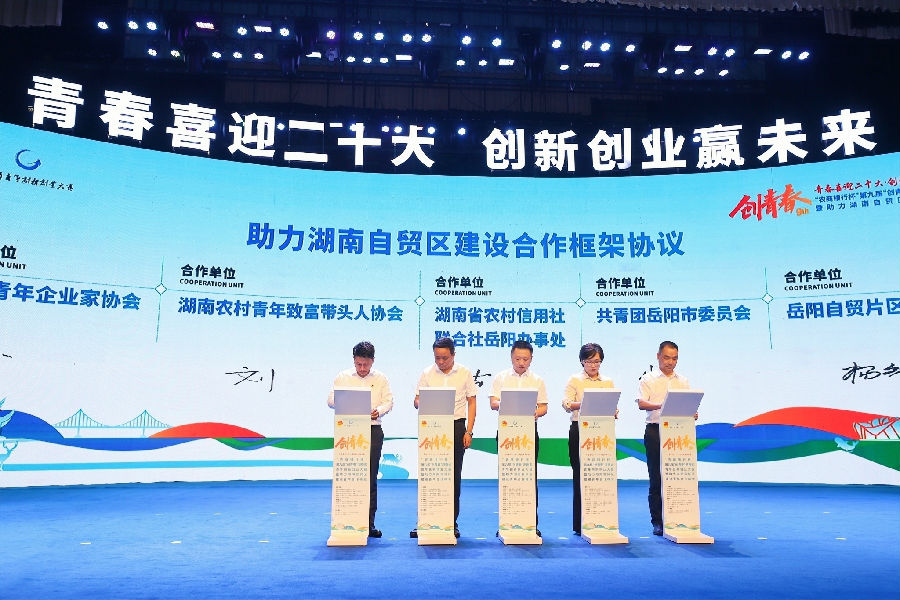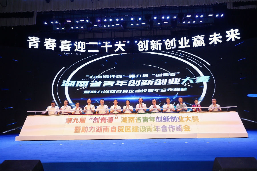 7月25日,“农商银行杯”第九届“创青春”湖南省青年创新创业大赛暨助力湖南自贸区建设青年合作峰会在岳阳开幕。市委书记曹普华,团省委书记李志超,省农信联社党委副书记、副理事长、主任黄向阳,团省委副书记刘静,市领导汪涛、谢胜、李美云,省直相关部门单位有关负责人共同启动活动。各市州团委相关负责人、青年企业家和青年创业者代表、参赛选手等500余人参加此次活动。