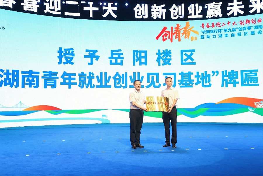 省农信联社党委副书记、副理事长、主任黄向阳为岳阳楼区授予“湖南青年就业创业见习基地”牌匾