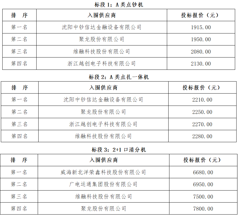 湖南省湘咨工程咨询管理有限责任公司受湖南省农村信用社联合社的委托,对其湖南省农村信用社联合社现金机具选型入围项目进行国内公开招标。本项目于2025年9月25日在湖南省湘咨工程咨询管理有限责任公司(湖南省长沙市雨花区雨花路88号大鸿杰座六楼)进行了开标、评标。本项目评标办法采用[综合评估法],评标工作已经结束。评标委员会推荐了以下三个标段中标人(排序),现将相关信息予以公示。