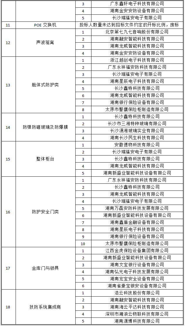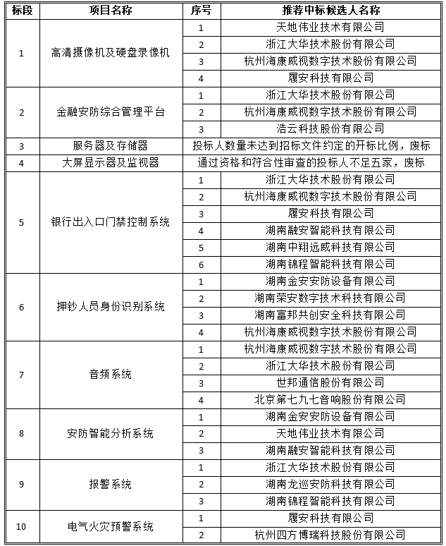 湖南国联招标有限公司受湖南省农村信用社联合社的委托,对2025年安防产品供应商和集成商入围项目(招标编号:0646-254HNGLN0590)所需货物和服务进行国内公开招标。本项目的招标采购讯息于2025年9月25日在“中国招投标公共服务平台”(http://www.cebpubservice.com/)、“湖南省农村信用社联合社官网”(http://www.hnnxs.com)、“招采猫电子交易平台”(https://www.bidcat.cn/)上发布。项目于2025年10月29日上午9:00(北京时间)在“招采猫电子交易平台”开标,随后进行评标。评标委员会成员经过认真、仔细的评议,并提出评标报告,推荐的各标段中标候选人排序如下: