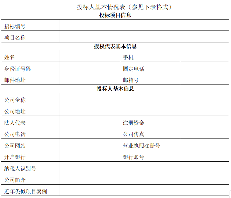 备注:外地或者本地不能来现场报名的投标人可以将“投标人基本情况表”完善后,连同“单位介绍信”、“标书款转账底单”一起扫描发送至hnglzb@163.com,招标代理机构将及时办理报名登记。