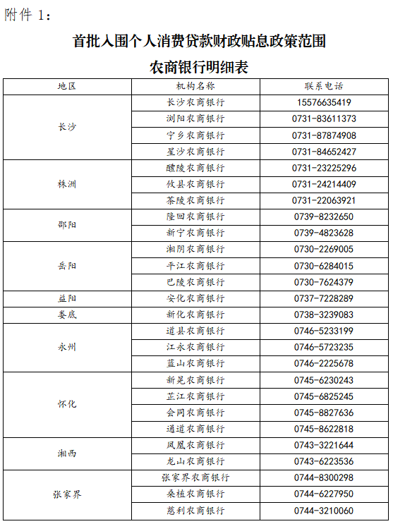 为贯彻落实党中央、国务院决策部署,降低融资成本,激发市场活力,根据《关于优化实施个人消费贷款财政贴息政策有关事项的通知》《关于优化实施服务业经营主体贷款贴息政策的通知》《关于实施中小微企业贷款贴息政策的通知》等相关规定,湖南农信系统内有关农商银行将对符合条件的个人消费贷款及信用卡账单分期、服务业经营主体贷款、投向相关重点领域产业链及其上下游产业的全部中小微企业(包括但不限于由支持小微企业融资协调工作机制推荐或由工业和信息化部共享的优质中小微民营企业)固定资产贷款等提供财政贴息支持。政策实施期为2026年1月1日至2026年12月31日。首批入围贴息政策范围的农商银行详见附件,具体实施以农商银行解释口径为准。