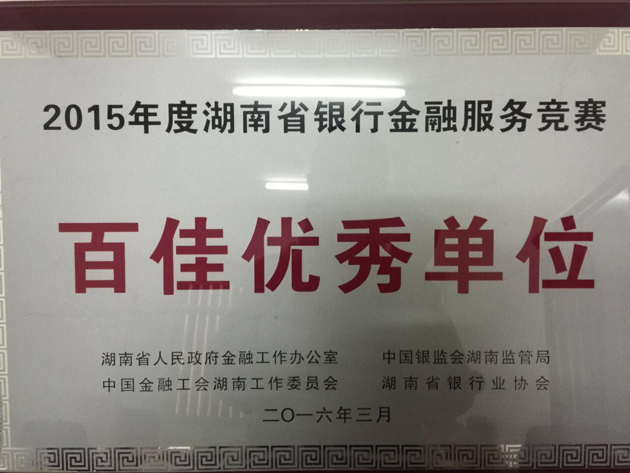4月1日,全省“2015年度湖南银行业金融服务竞赛表彰大会”在长沙召开,此次表彰大会由省政府金融办、湖南银监局、省金融工会、省银行业协会共同主办,会上慈利联社营业部被授予“百佳优秀单位”荣誉称号。这是该行营业部继荣获全市银行业协会“服务明星网点”和全市农信社(农商银行)精品网点后的又一殊荣。