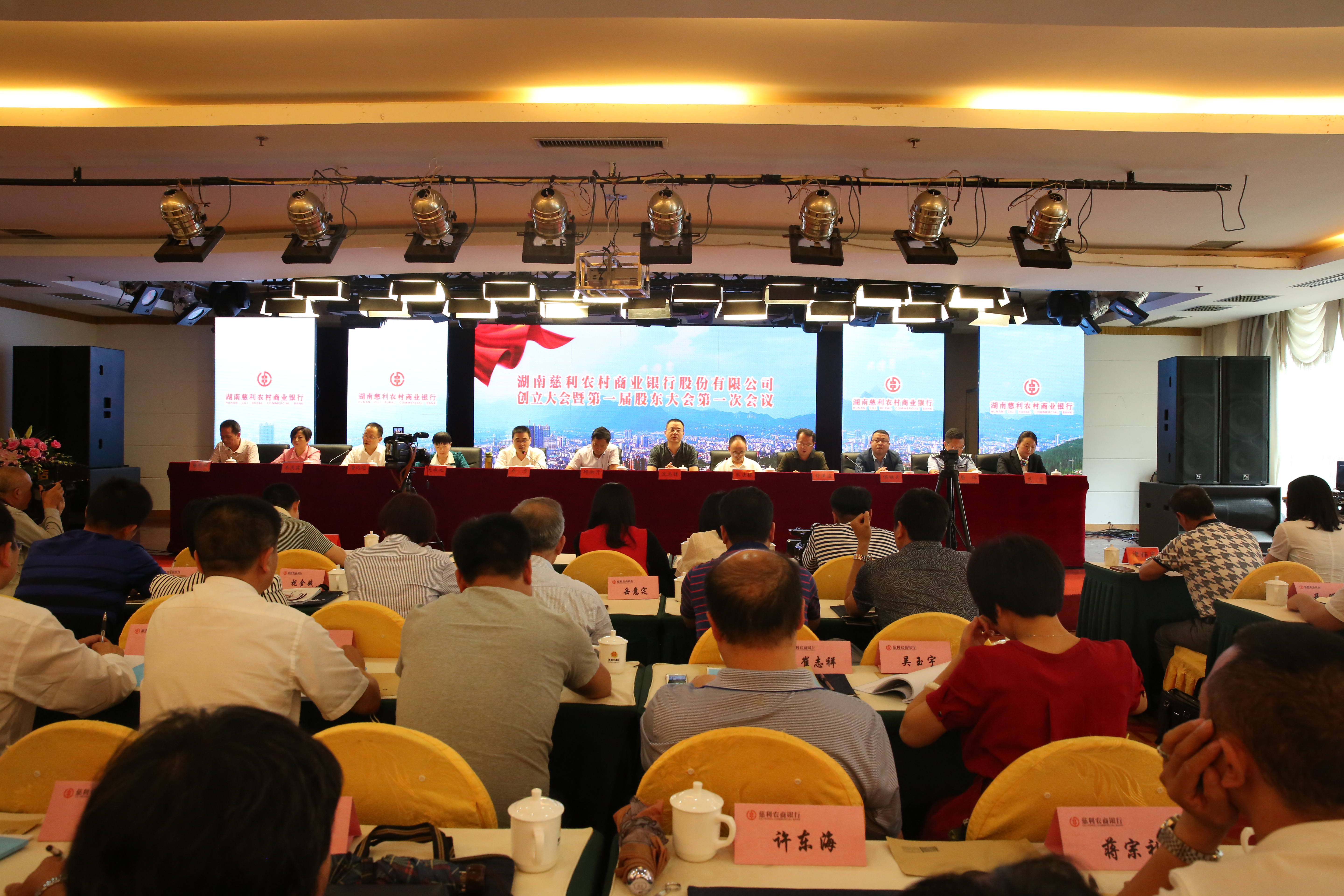 会议宣读了《中国银监会湖南监管局关于筹建湖南慈利农村商业银行股份有限公司的批复》,《湖南省农村信用社联合社关于同意湖南慈利农村商业银行股份有限公司董事、监事候选人的批复》;审议通过了《湖南慈利农村商业银行股份有限公司筹建工作报告(草案)》、《湖南慈利农村商业银行股份有限公司章程(草案)》、《湖南慈利农村商业银行股份有限公司第一届董事会董事选举办法(草案)》等15项议案,选举产生了第一届董事会股权董事和第一届监事会股权监事。召开了第一届董事会第一次会议和第一届监事会第一次会议,选举产生了董事长、副董事长、监事长,聘任了行长、副行长、董事会秘书等高管人员。湖南慈姑律师事务所2名律师对本次大会进行了全程见证,并出具了法律意见书。