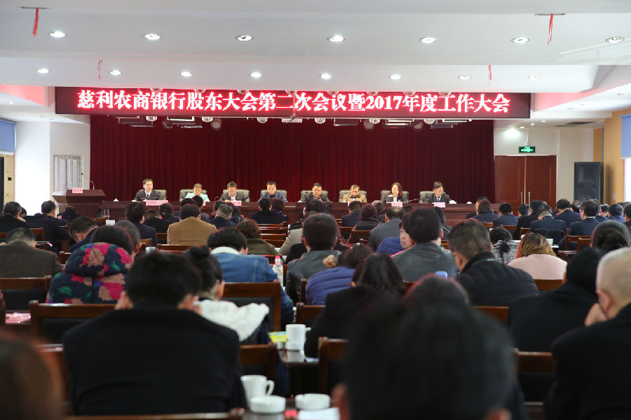 2月28日,慈利农商银行第一届股东大会第二次会议暨2017年度工作会议召开。全体股东、总行班子成员、行长助理,机关部室、基层网点负责人,受表彰的先进单位和个人代表以及除留守值班人员以外的全体员工近300人参加会议。慈利县人民政府副县长李勇、副县长朱新,省联社张家界办事处副主任钟玉远,张家界银监分局非现场科科长王晓峰,人民银行慈利县支行行长张芳芳应邀出席会议。