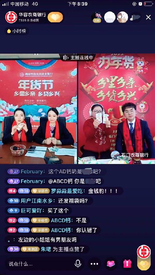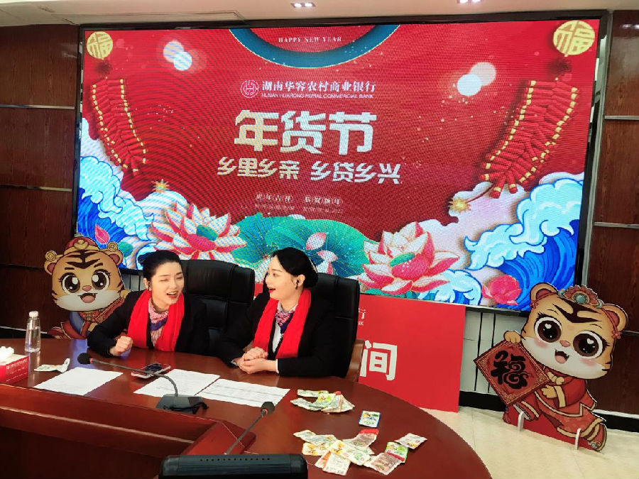 1月25日小年夜晚,为助农助商、带动本地特色农产品销售,大力宣传特色产业、饮食文化,由湖南石门农商银行发起,华容农商银行、湖北京山农商银行共同参与的“乡里乡亲·乡贷乡兴”年货节抖音直播活动顺利举行。主会场石门农商银行直播间同时在线人数突破一千人次,部分商品抢购一空。