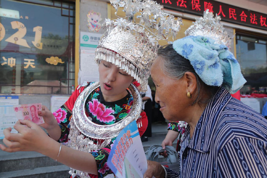 图解:在凤凰县山江镇,凤凰农商银行员工正在用苗语为苗乡阿婆介绍假币识别金融知识