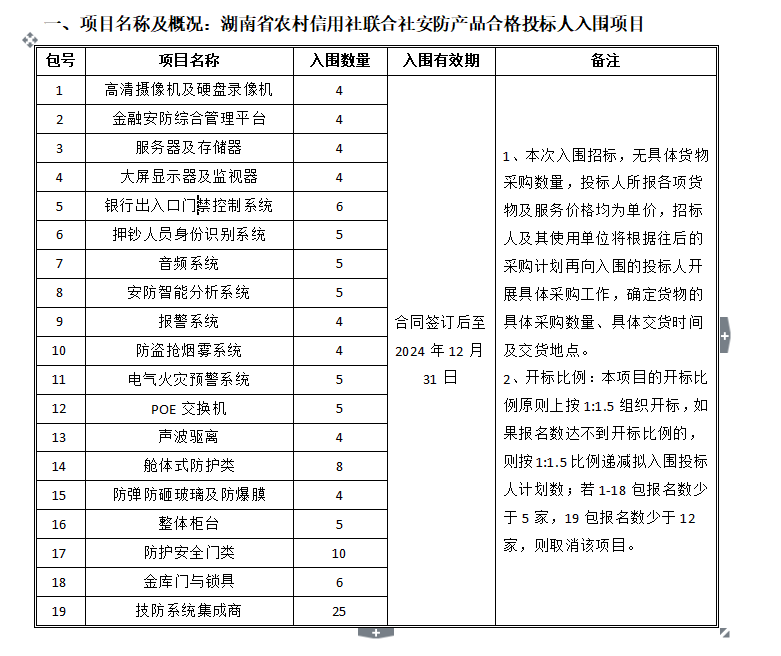 湖南国联招标有限公司受湖南省农村信用社联合社的委托,为湖南省农村信用社联合社安防产品合格投标人入围项目进行招标代理(电子化采购),现对该项目进行国内公开招标,欢迎具有相应资质并感兴趣的企业前来参与。