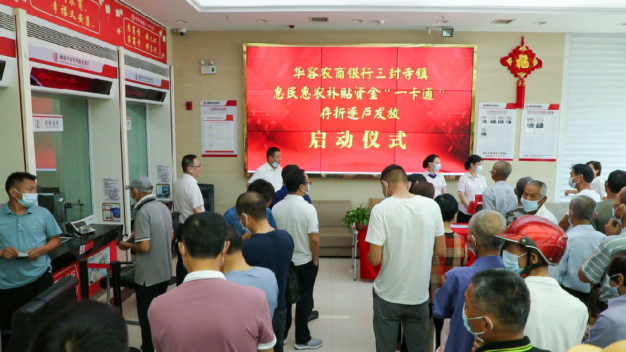 在启动仪式上三封寺镇党委副书记胡剑与华容农商银行纪委书记、监事长严毅群为前来的农户发放了“一卡通”存折。
