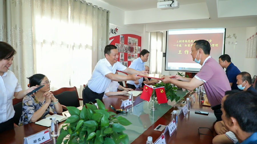 在发放仪式完成后,一行人来到三封寺支行三楼会议室就“一卡通”存折发放后续工作作了相关总结和部署。同时,会上部分村场代表发言表示将积极支持“一卡通”存折发放工作。