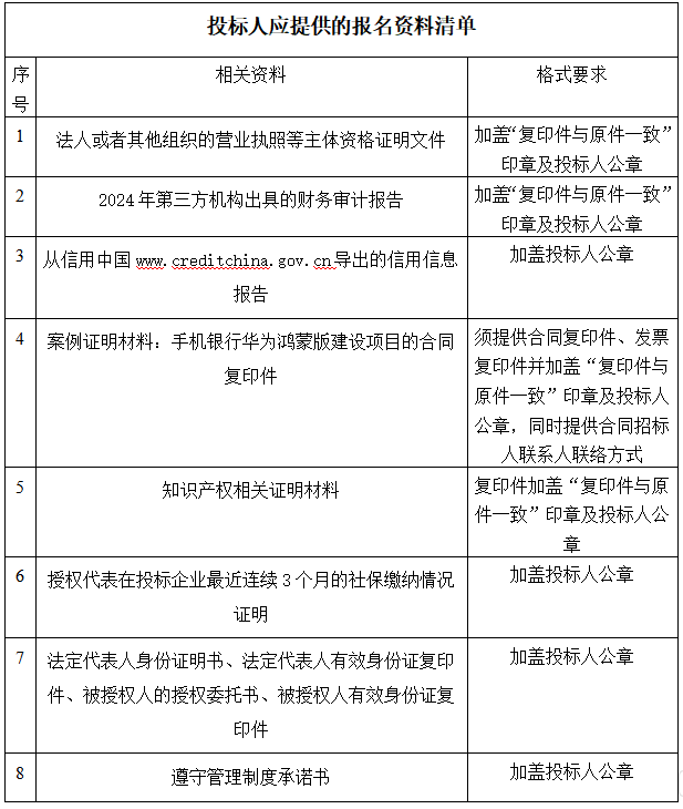 6.投标人必须要有一个近三年内(2023年4月1日至今)省级农信(含北京、上海、天津、重庆农商行)、或国有大型商业银行总行(共6家)、或全国性股份制商业银行总行(共12家)、或全国省级(含北京、上海、天津、重庆)城商行总行的手机银行华为鸿蒙版APP(个人或企业均可)的相关项目实施经验和案例(银行名单以国家金融监管局《银行业金融机构法人名单(截至2025年6月末)》为准)。须提供合同复印件、发票复印件并加盖“复印件与原件一致”印章及投标人公章,同时提供合同招标人联系人、联系方式,“人力外包合同”、“配合改造合同”、“升级优化合同”、“维保类合同”、“维护类合同”、“接口开发类合同”除外。